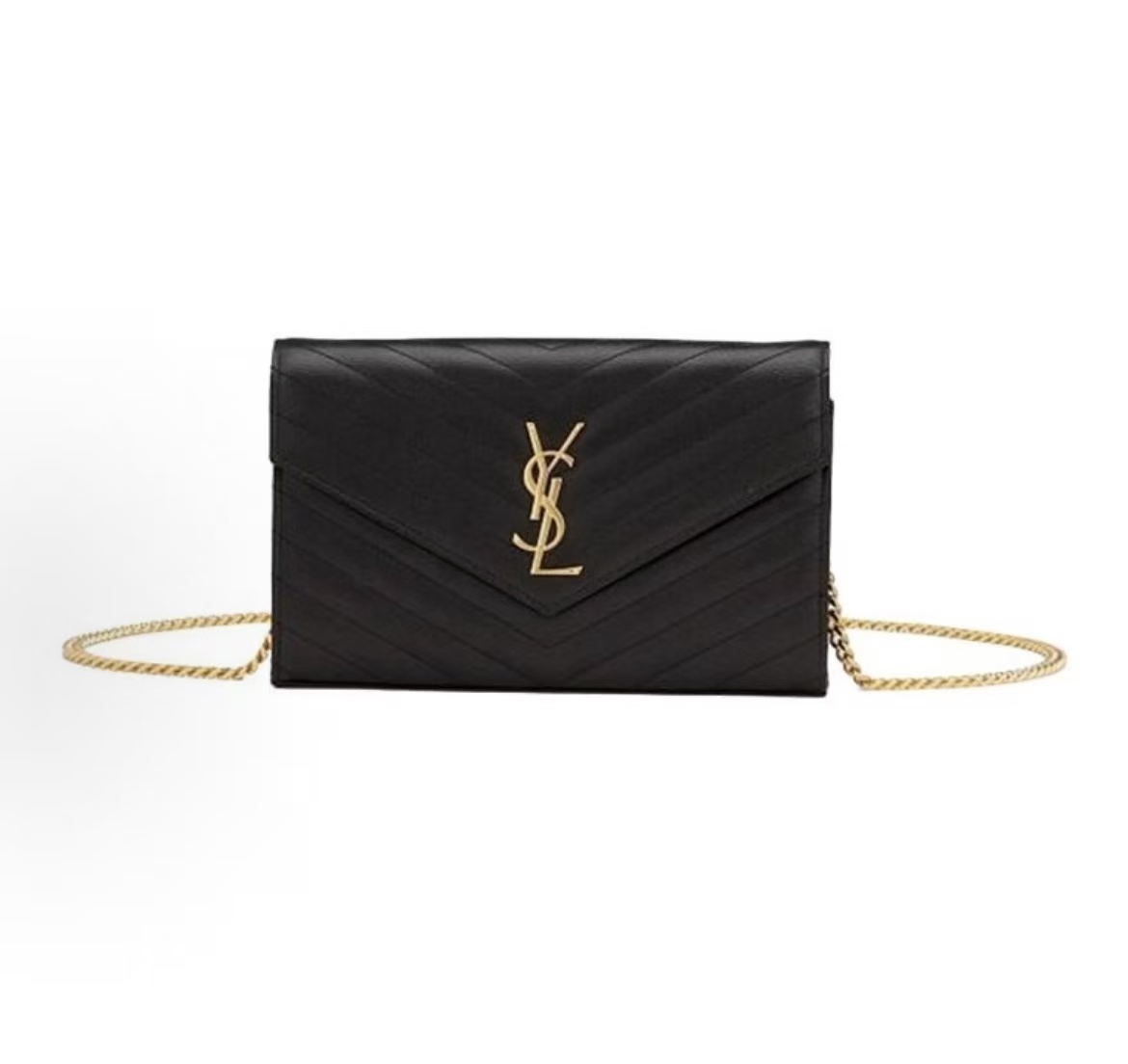 Black Chevron-Quilted Envelope Bag with Metal Accent, Chain Crossbody Style