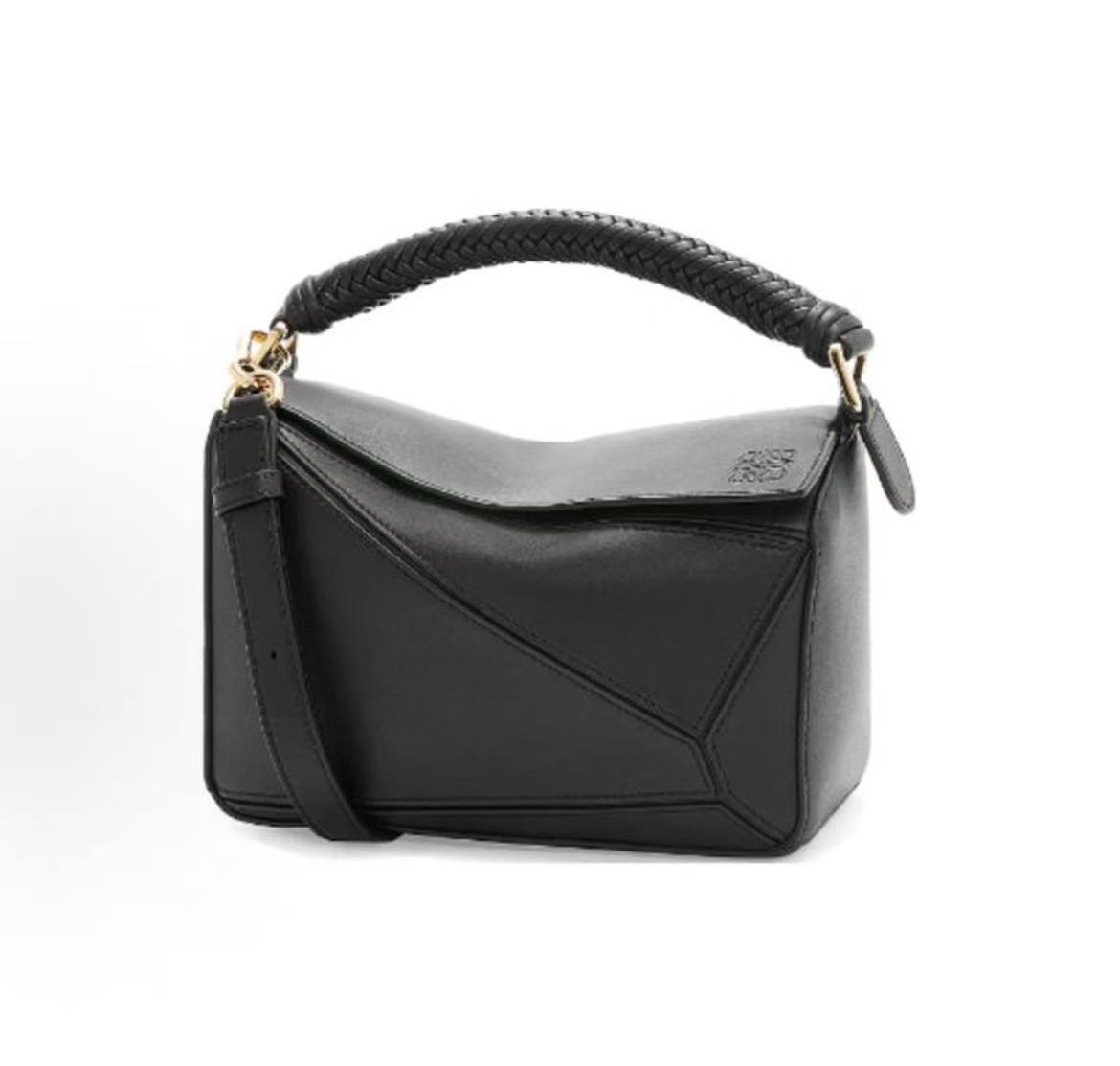 Black Geometric Panel Leather Bag with Woven Handle - Minimalist Shoulder/Crossbody Bag for Daily Commute