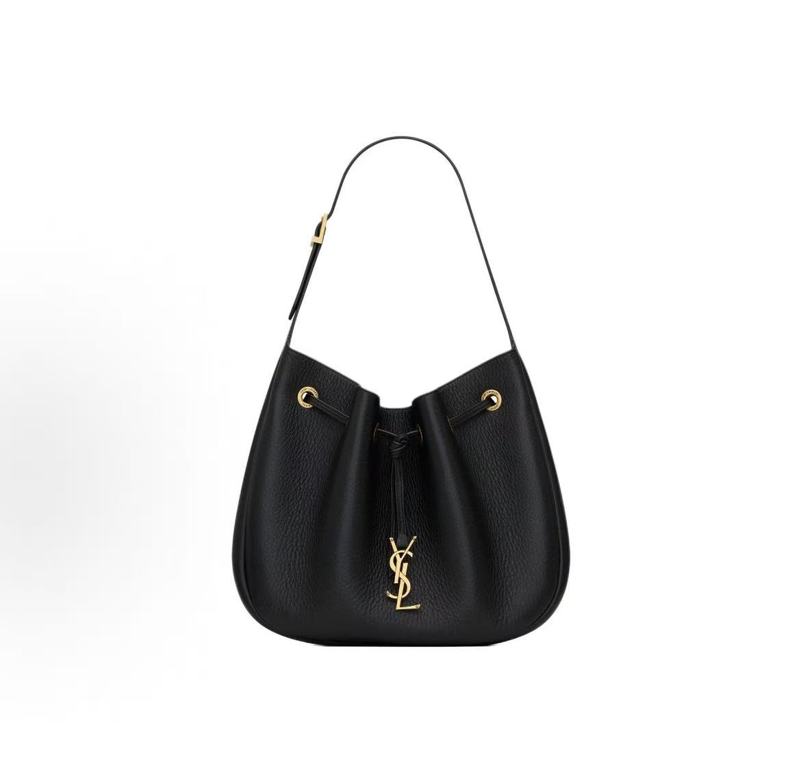 Black Pebbled Leather Drawstring Bucket Bag with Metal Accent, Shoulder & Crossbody Style