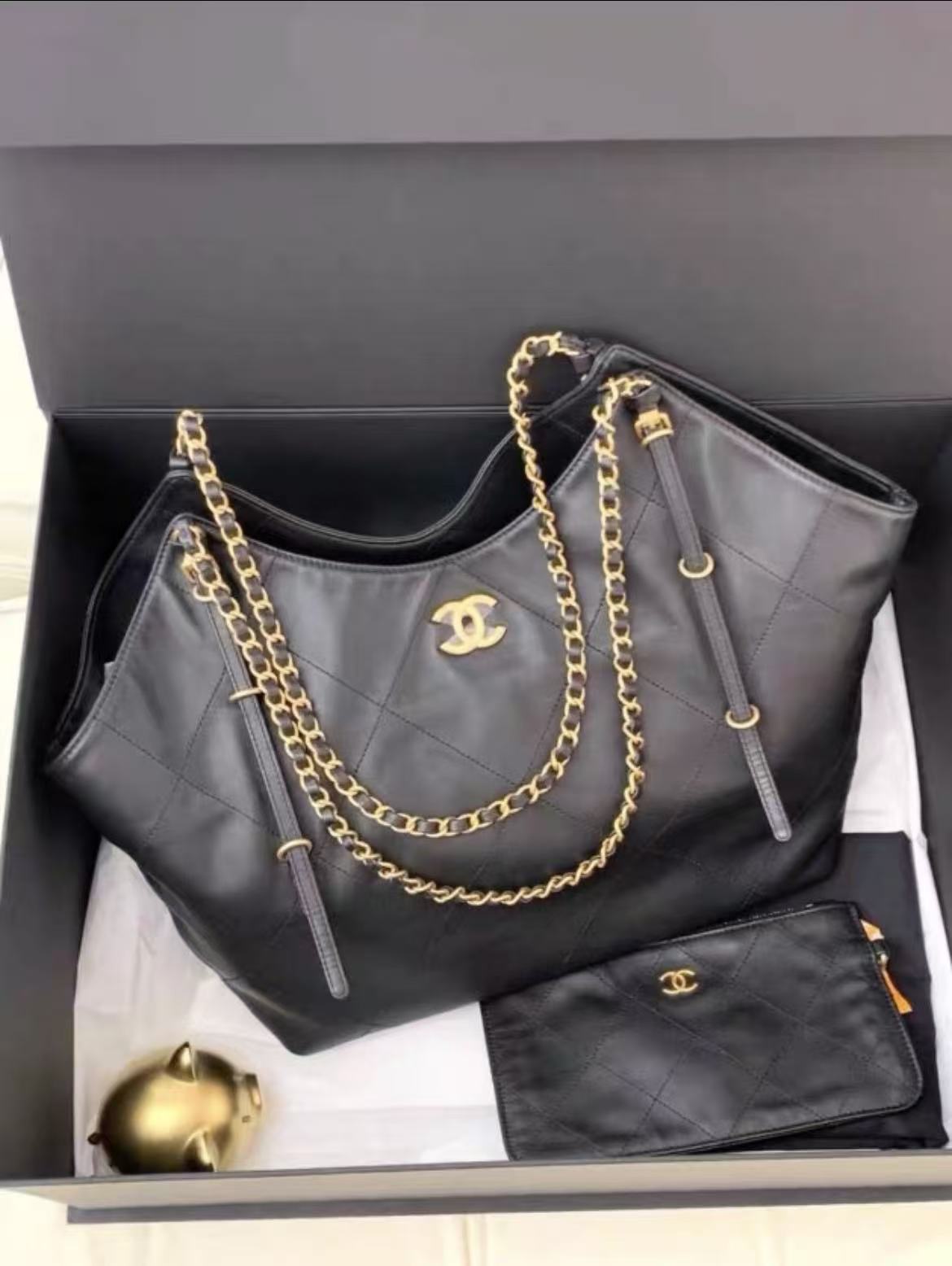 Black Quilted Leather Mother-Daughter Bag Set (Gold Chain Strap + Large-Capacity Tote)